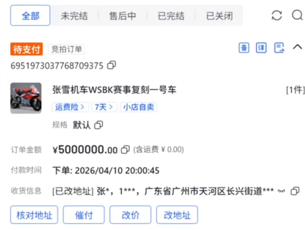 4月3日,张雪机车创始人张雪在个人社交平台宣布,将在4月10日20时拍卖冠军复刻赛车,9日又宣布奖品加码,随车赠送张雪机车此次夺得的“最快圈数”奖杯。