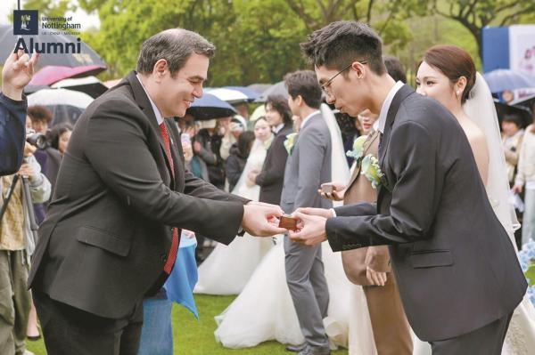 典礼上,宁波诺丁汉大学执行校长乔纳森·加里波第教授现场致欢迎辞,言语间满是对新人的祝福。“大学不仅是学术成长的殿堂,更是人与人之间建立深厚联结的地方。”他表示,看到校友们在这里收获知识、友谊,更收获相伴一生的爱情,学校倍感欣慰,也希望新人们能带着在宁诺的美好记忆,在未来的人生路上携手前行,永远珍惜彼此。