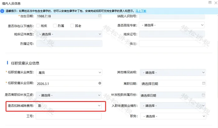 需要注意的事,该调整不影响可选择“一次性扣除6万元减除费用”的员工,以及在员工信息采集时“是否扣除减除费用”选项主动选择“否”的人员