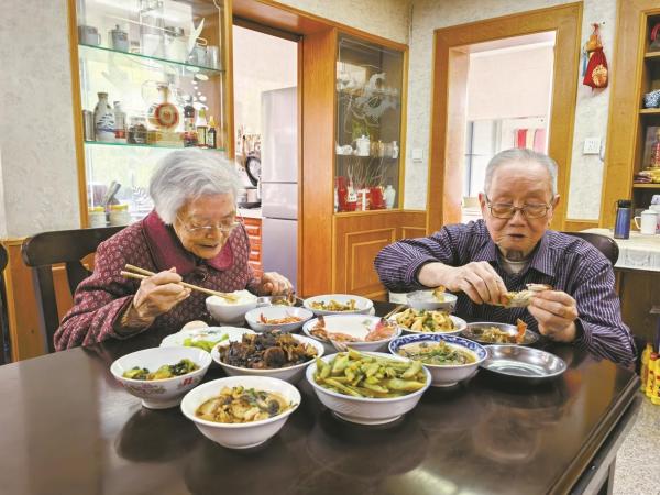 正午的阳光透过窗棂,洒在慈溪市浒山街道虞波北园的一对老夫妻的餐桌上,暖意融融。