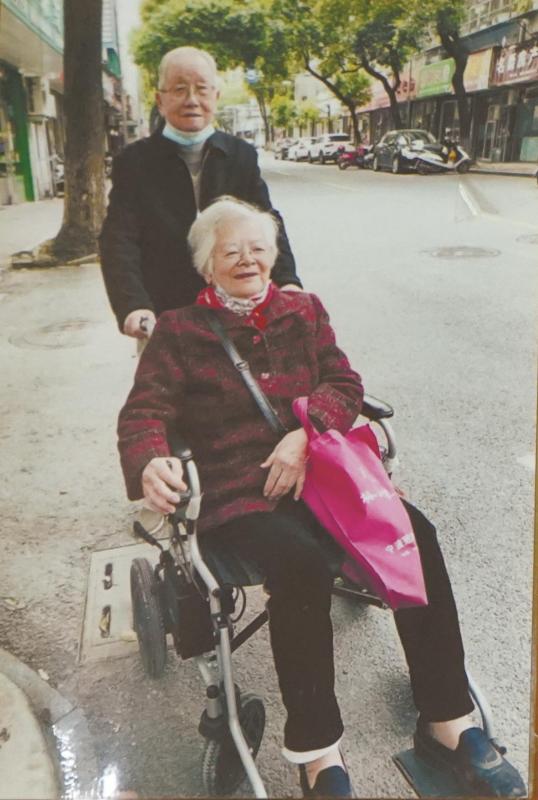 两位老人时常趁天气好,互相换坐轮椅,出去买菜散步。