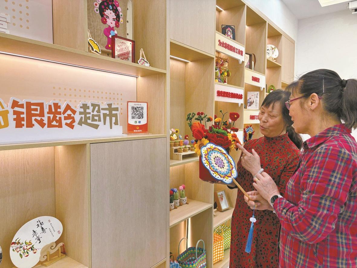 擅长手工的老年人,可以把自己的作品送到银龄超市展示售卖,所得收益全部归作者所有,街道仅提供场地支持与宣传推广,让银龄达人被更多人“看见”。