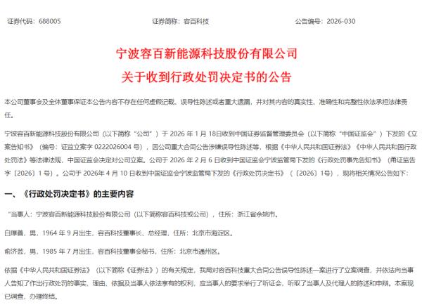 4月10日晚,容百科技发布公告称,收到中国证监会宁波监管局下发的《行政处罚决定书》。