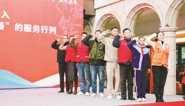 2026年象山县学雷锋志愿服务月启动仪式上,奚敏敏(右一)领头宣誓。