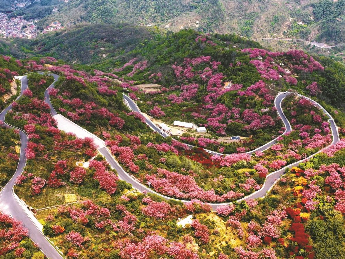 车辆行驶在起伏蜿蜒的柏油路上,每转过一道弯,车窗前便展开一幅新的花海画卷。不同于人挤人的网红打卡地,这里的樱花沿路自然生长,与原始山林融为一体,真正实现“车在花中行、人在画中游”。