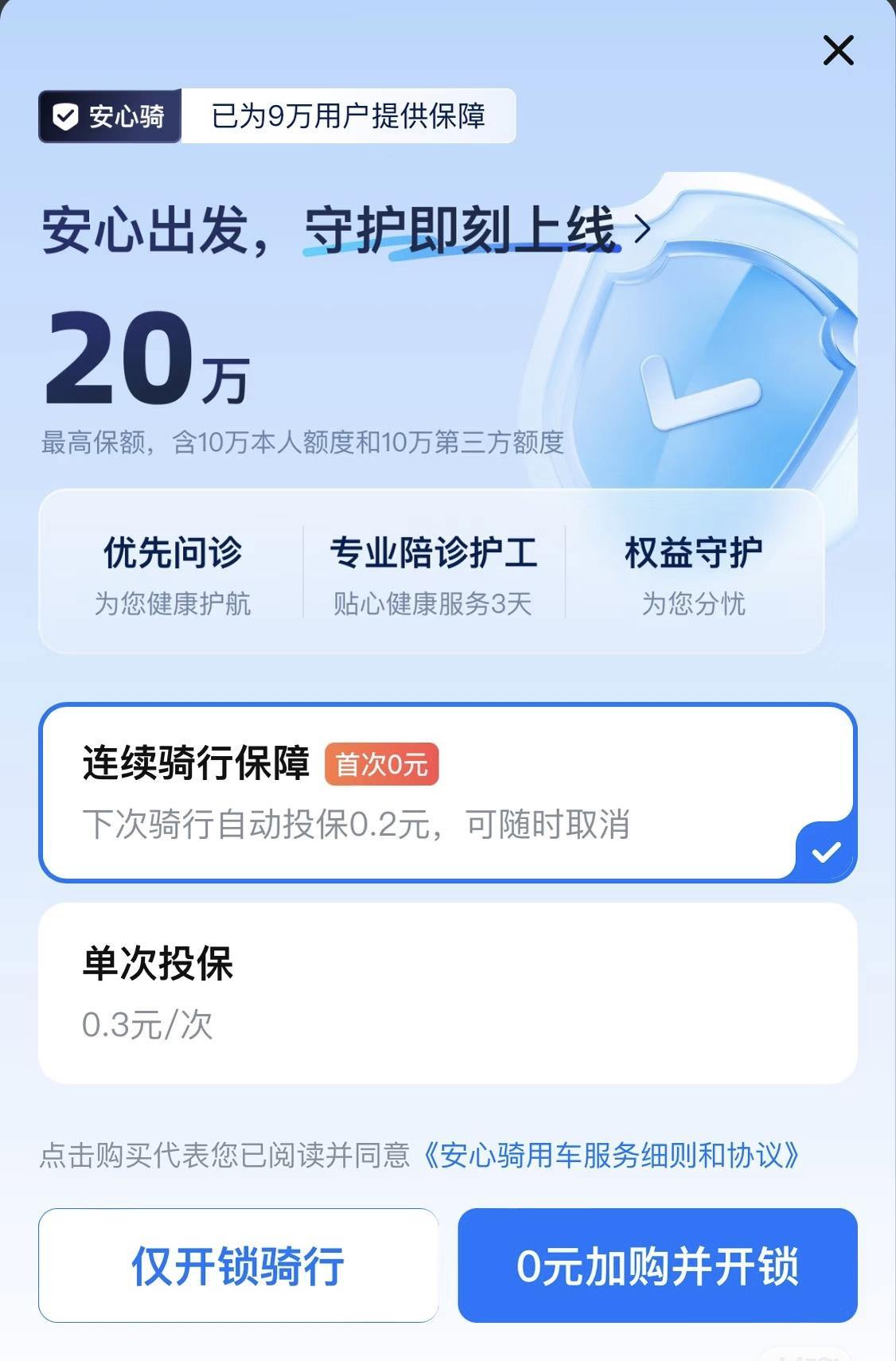 小李遇到的是一个名为“安心骑”的弹窗广告,是哈啰官方近期推出的一项服务,该保险页面会在扫车时自动弹出,且默认勾选“连续骑行保障”选项,每次骑行保费为0.2元。目前,社交平台上仍有大量网友反馈不小心选择了该服务,直到多次自动扣费后才发现。