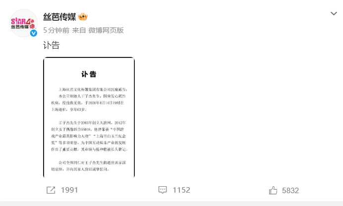 丝芭传媒发讣告:本公司创始人王子杰先生,因突发心源性疾病,经抢救无效,于2026年4月14日19时在上海逝世,享年63岁。王子杰,1963年生于上海,祖籍浙江宁波。现任上海丝芭文化传媒集团有限公司总裁。