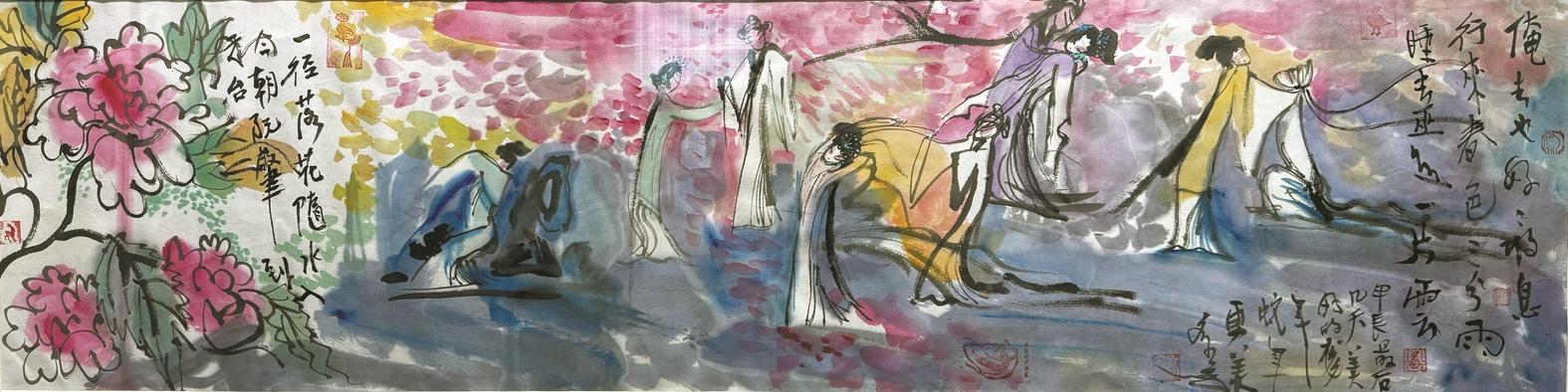 《牡丹亭》《拾玉镯》《三岔口》《白蛇传》《西厢记》《刘阮遇仙》……秀才小姐、官人娘子,伊伊呀呀、叮格隆咚锵,让人进入戏曲的世界。画中,那些线条是活的,如流水一般蜿蜒辗转,丝丝缕缕,如泣如诉;用墨用色更是大胆泼辣,他善于运用淡墨和浓墨,使墨色产生轻重浓淡的丰富层次和效果,在色彩上,绮丽中不失淡雅,绚烂中透着高级感。加上散点透视的处理,画面效果平淡天真,富有趣味。所谓人生如梦,人生如戏,高多就像在纸上做了一场梦。