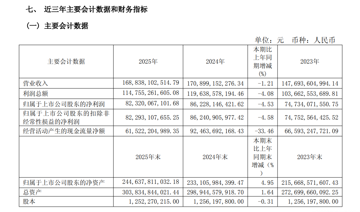 贵州茅台2025年年报正式出炉,营收和净利润双双下滑。