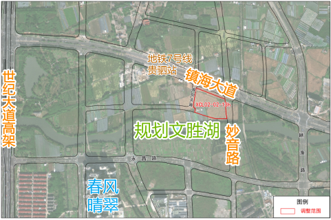 该地块位于镇海大道和规划妙音路交叉口的西南侧、轨道交通7号线贵驷站站口,南侧是规划文胜湖,湖对面是包括绿城·春风晴翠府、绿城·春语云树府、久桦府等次新小区以及妙景和庭、东桂新苑等安置房小区在内居住氛围正日益成熟的一个区域。