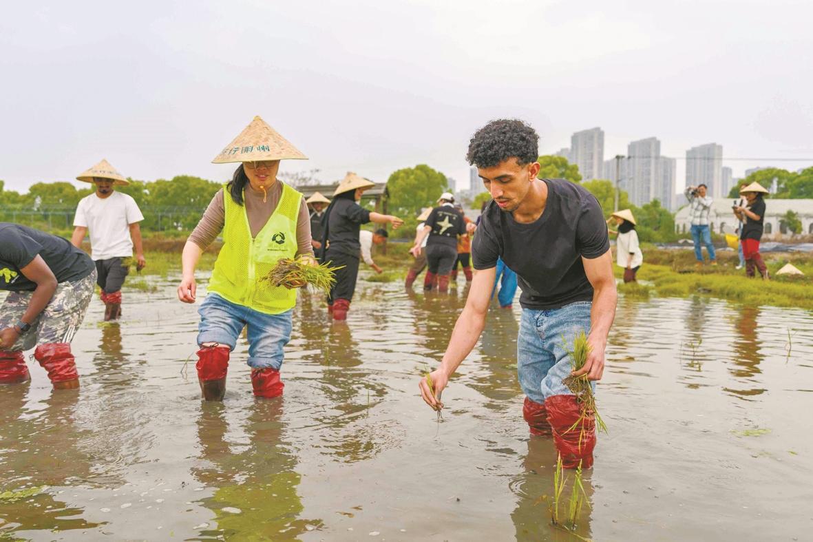 中外青年体验插秧。