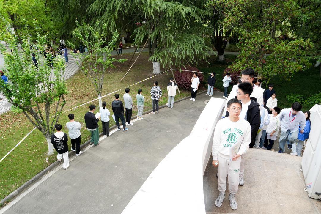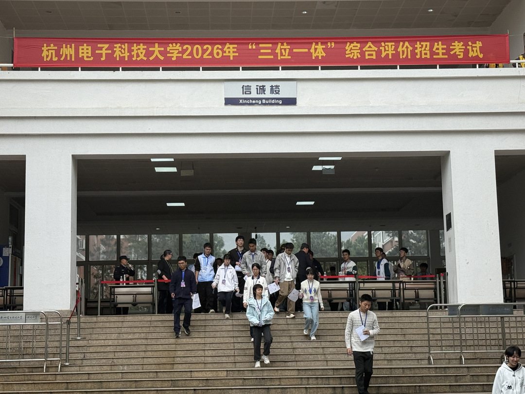 在杭电下沙校区,一位从温州赶来的妈妈正和儿子步履匆匆。他们是下午第一场,要赶在11点10分前候场。这个温州男生首考402分,选考偏文,却很向往杭电交叉学科的氛围。