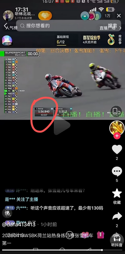 4月19日,张雪机车的53号车手瓦伦丁·德比斯在世界超级摩托车锦标赛(WSBK)2026赛季第三站荷兰站第二回合Warm-Up热身练习赛中取得第一名,成绩为1分36秒840。据了解,该热身赛不直接计入正赛积分,主要是为了让车手适应场地的赛道温度、天气等因素。