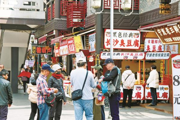 游客在鼓楼步行街买小吃。(孙佳骏/摄)