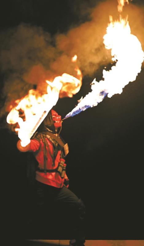 萨克斯声缓缓流淌,越剧婉转灵动,夜幕降临后,一场喷火表演,瞬间将现场气氛带动起来。不同于传统喷火表演,当晚的表演者身着游戏角色“赛伊德”的造型,一登台就吸引了全场目光。