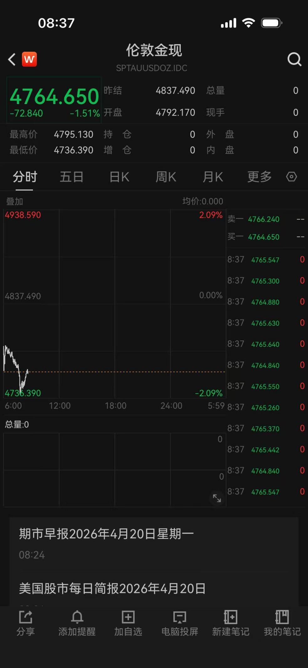 4月20日早盘,国际金价大幅低开,最低触及4736美元/盎司附近,截至发稿时,仍然大跌1.51%,交投于4764.650美元/盎司。