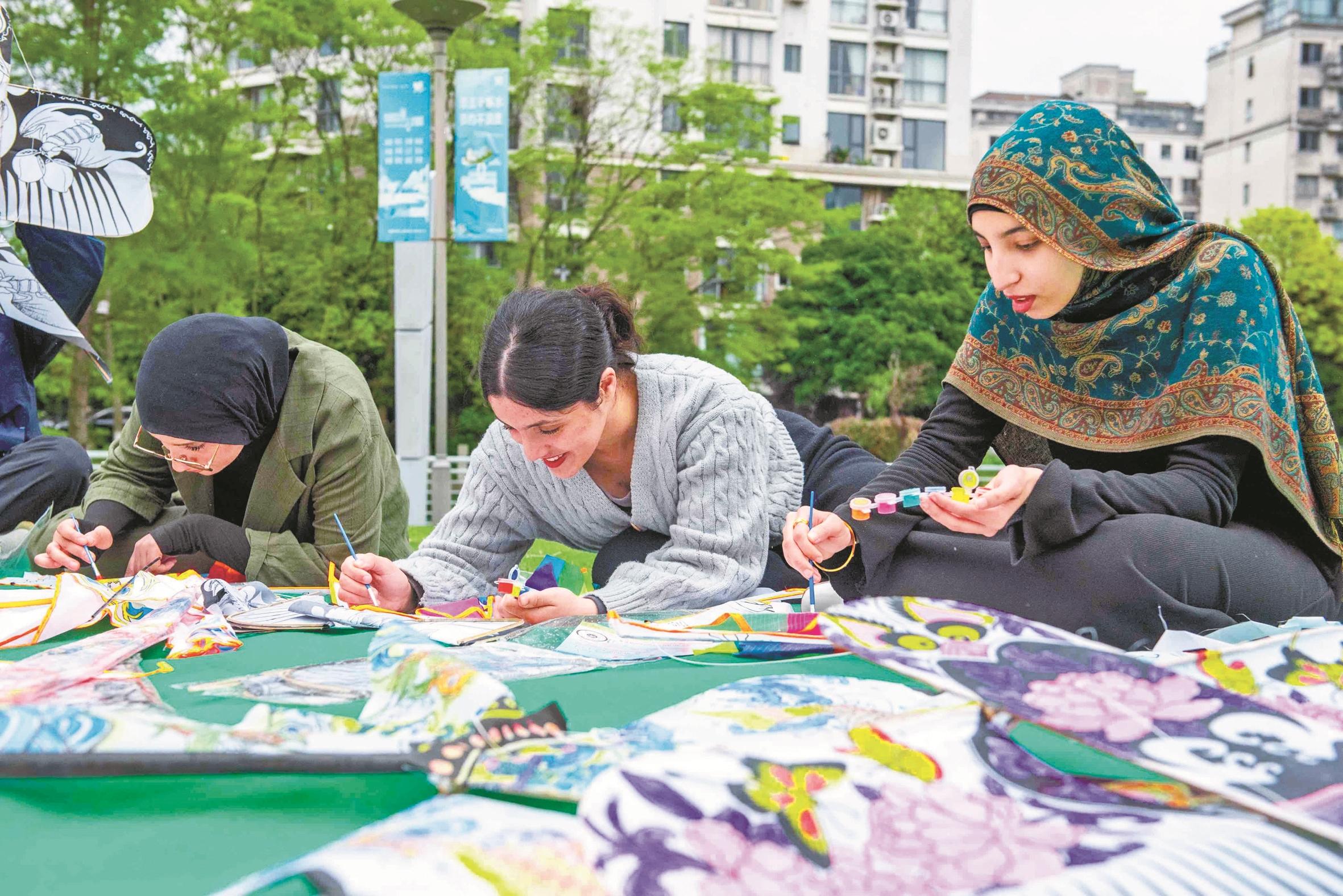 4月甬城风和日丽,海曙区段塘街道丽景社区邀请宁波大学国际学生,在新典公园开展“春风托纸鸢 欢乐伴春行”活动,以风筝为媒,让留学生感受春日乐趣,体验中国传统手工魅力。(宁波日报 甬派客户端 徐能 张昊桦 庄涵予 摄)