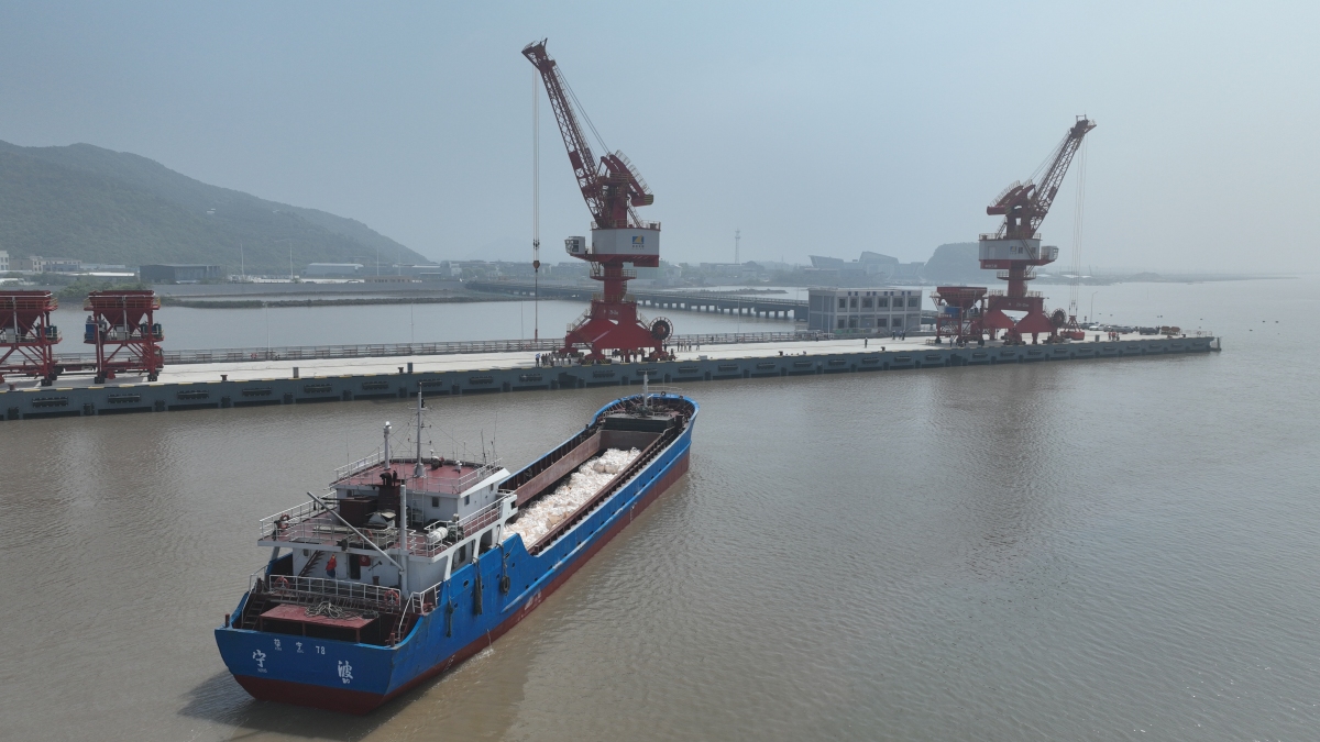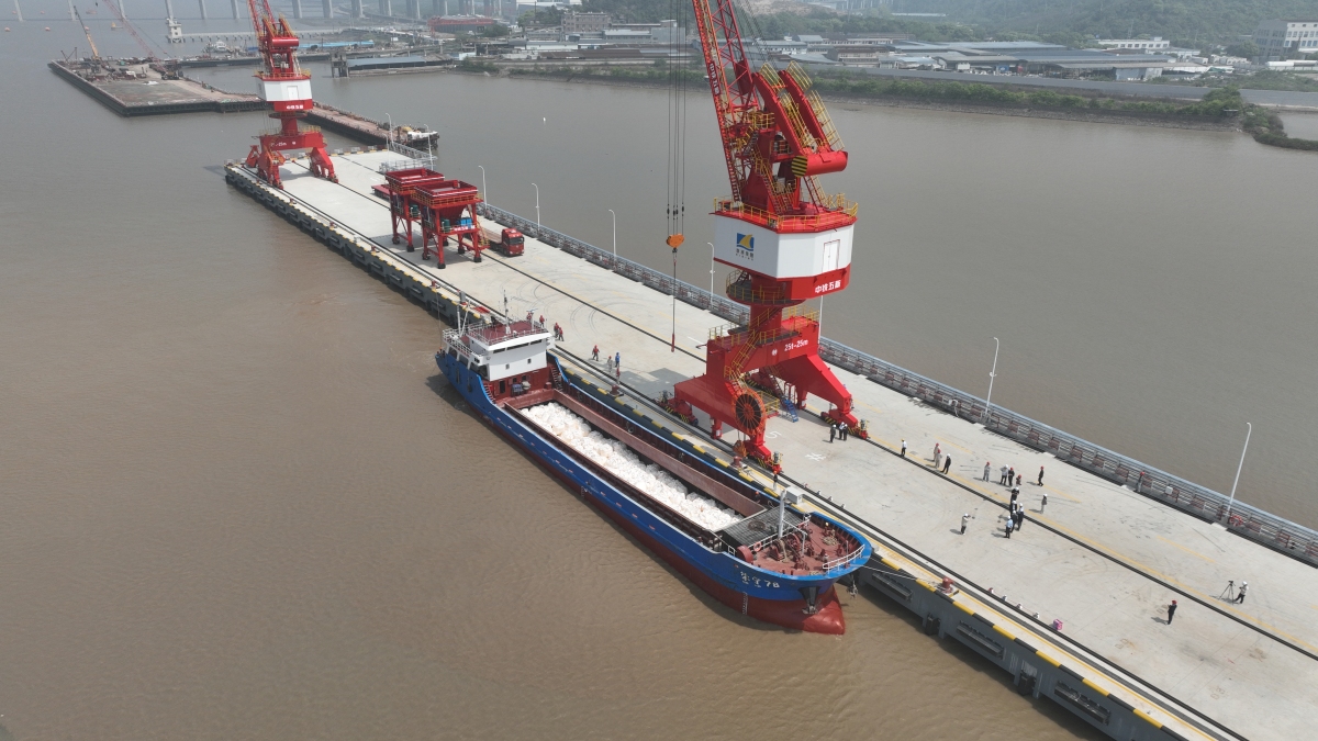 这是该码头建成后迎来的首艘载货船舶,标志着三门湾区域首个规模化散杂货码头投入运行。