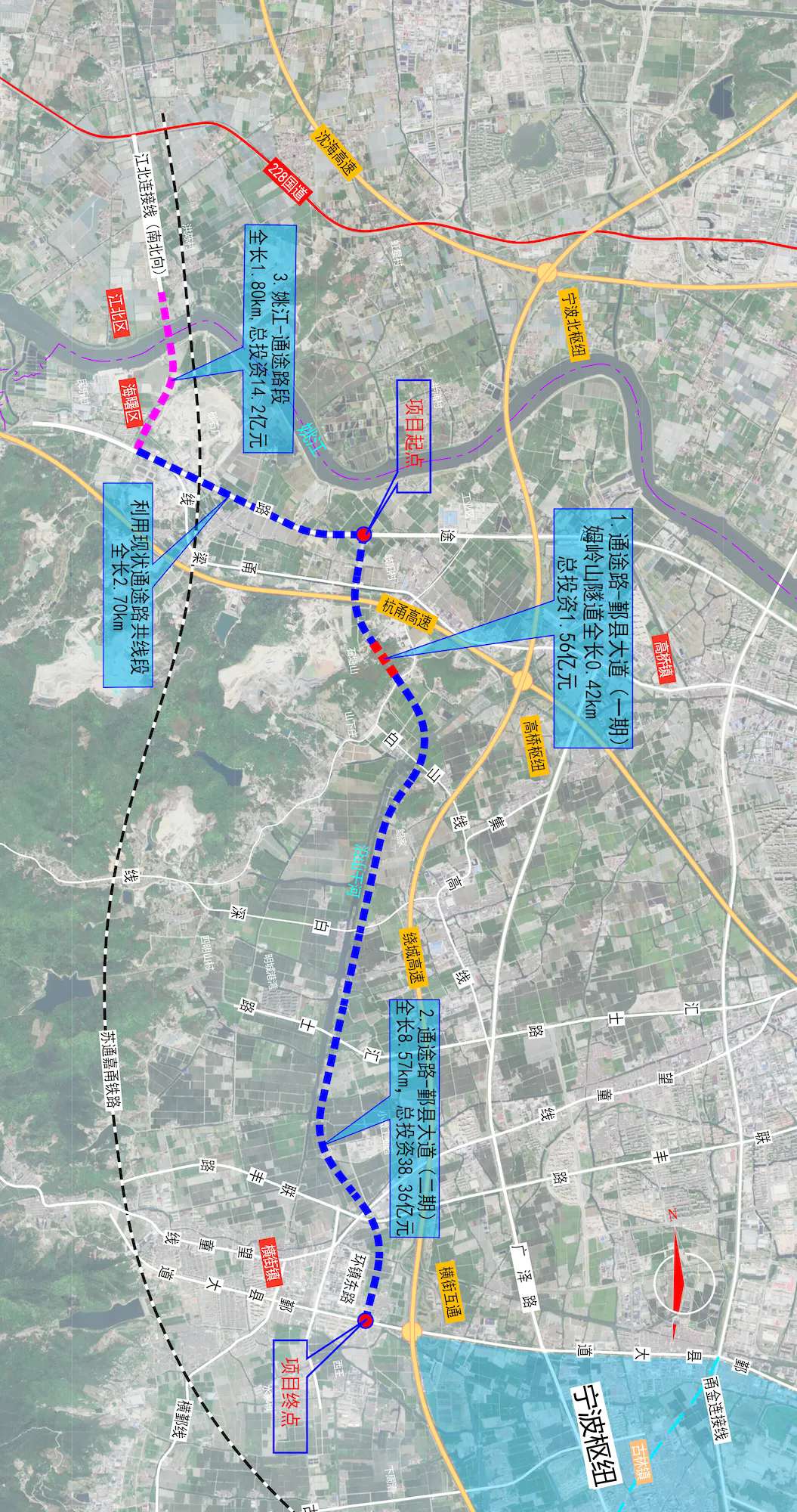 228国道海曙段工程(姚江—通途路)整体走向示意图如下: