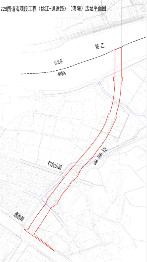 228国道海曙段工程(姚江-通途路)南段区位图和选址平面图如下: