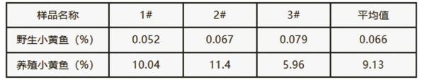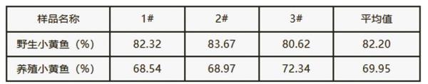 从实验结果可以看出,样本中的野生小黄鱼含水量更高。高含水量的鱼肉在口中会有明显的“爆汁感”和“嫩滑感”。水分主要存在于肌纤维之间,经高温烹饪后水分适度流失,肉质显得非常细嫩、入口即化。但野生小黄鱼不耐久煮,烹饪时间过长,肉质容易失水变柴、口感变差。