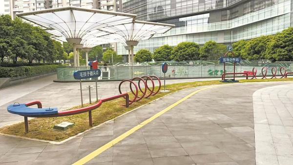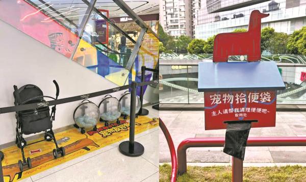 江北区的万象城专门设置了宠物卫生间——“便便收集所”和狗狗撒欢地,配备了隔尿垫、拾便袋、宠物专用湿巾及消毒喷雾。来福士广场设置了室外“毛孩子接头处”,供“毛孩子”交友玩耍,并提供拾便袋。
