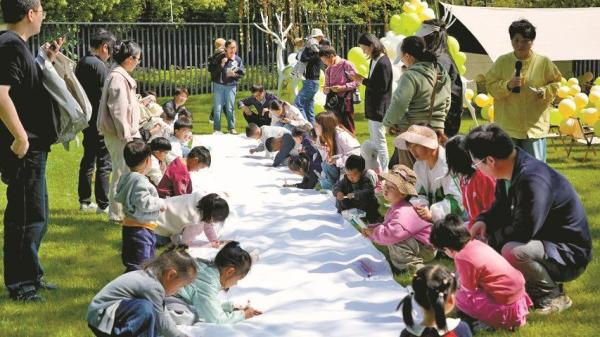 昨天中午,海曙区段塘街道丽欣社区鎏金府小区的草坪上,一幅百米长卷铺展。20个家庭围坐两侧,描绘“2030年的我、家、社区”,时光胶囊同步封存,珍藏孩子们的五年心愿。