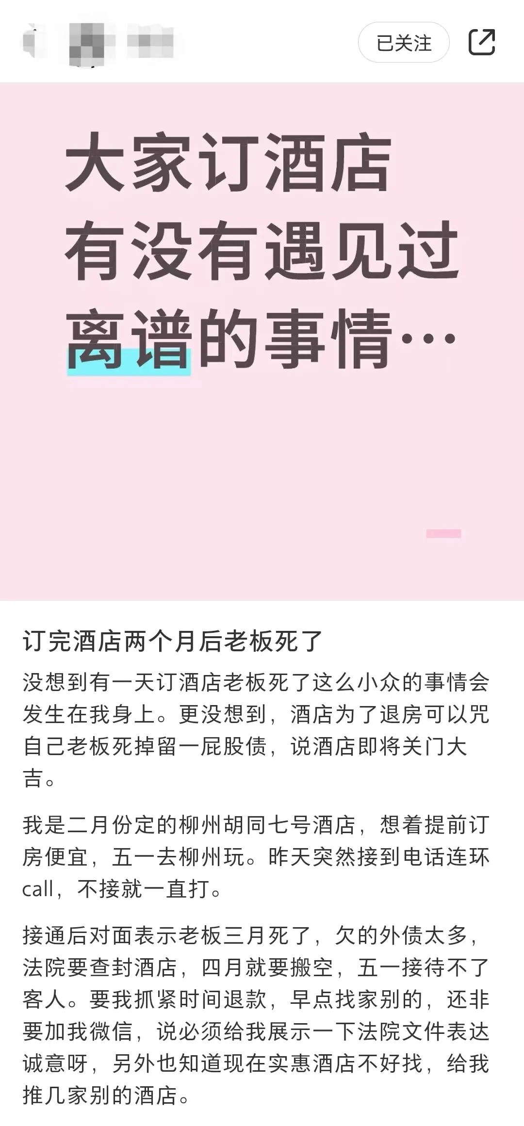 提前两个月低价预订五一酒店,临近出行却被商家以“老板离世、门店将查封”等离谱理由要求退房。