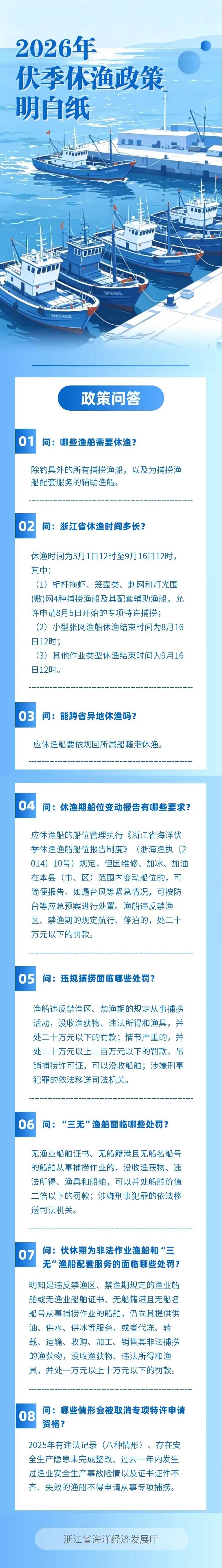 据浙江省海洋经济发展厅消息,自2026年5月1日12时起东海全面进入伏季休渔期。