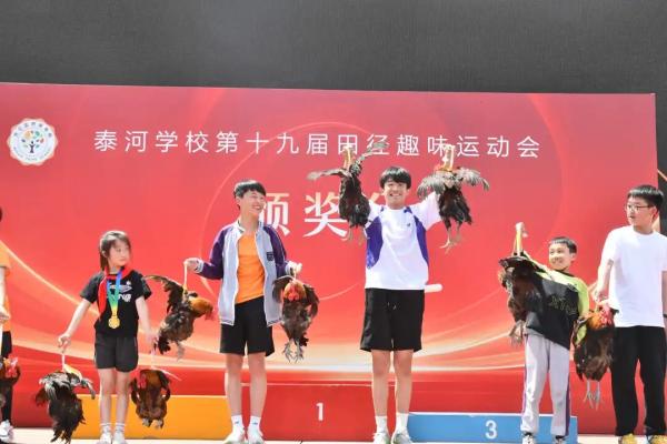 4月27日,北仑区泰河学校第十九届田径运动会闭幕式上,一场别出心裁的颁奖典礼瞬间引爆全场欢呼声——打破校纪录的运动小将们,亲手领到了专属大奖:一只只四五斤重的大公鸡。
