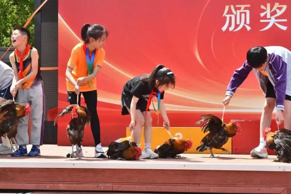 当沉甸甸的荣誉与鲜活的大公鸡一同送到同学们手中时,现场瞬间被欢乐的氛围包围。大公鸡活力满满、不停扑腾翅膀,头一回近距离捧着活家禽领奖的小将们,又紧张又兴奋。大家抱着这份独一无二的大奖,站在领奖台上,定格下专属自己的高光纪念时刻,操场上掌声、笑声、欢呼声此起彼伏,氛围感直接拉满。