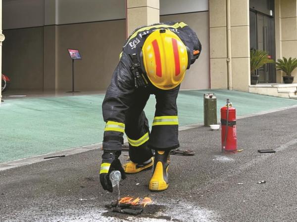 消防人员进行模拟充电宝明火状态扑救针对性实验。