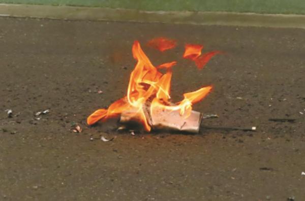 另一组实验模拟用水扑灭明火。充电宝起火后,呈喷射状燃烧状况,最高温度超过350℃。随后,消防员用一瓶纯净水浇了上去,明火很快扑灭。10秒钟后,未燃尽的充电宝表面温度已降至85℃。3分钟后,温度已降至30℃以下。在此期间,已成残骸的充电宝未发生复燃和二次灭火情况。
